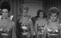 Having already battled all villains natural and supernatural, it’s only natural for Santo to take on a menace from outside the Earth’s orbit. And WHAT a menace – a tagteam of all-blonde Martians resembling Surf Nazis, but changing their appearance mid-film to Greek gods and goddesses (so as to not attract attention in modern-day